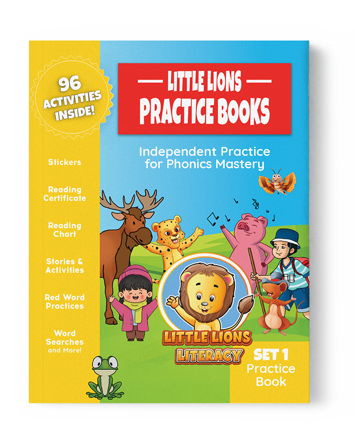 The Little Lions Practice Books Bundle is the perfect companion to Little Lions Decodable Books Sets 1, 2, and 3. This bundle contains 288 worksheets, 96 per book, with six fun and engaging activities for each of the 16 phonics concepts in each level. Young learners will enjoy practicing essential reading, writing, and spelling skills. Activities include: Match and Unscramble, Read and Color, Spell and Write, Read and Draw, Red Word Practice, and Word Search. Practice books contain Reading Charts & Sticker Sheets to track progress and Reading Certificates to celebrate success!